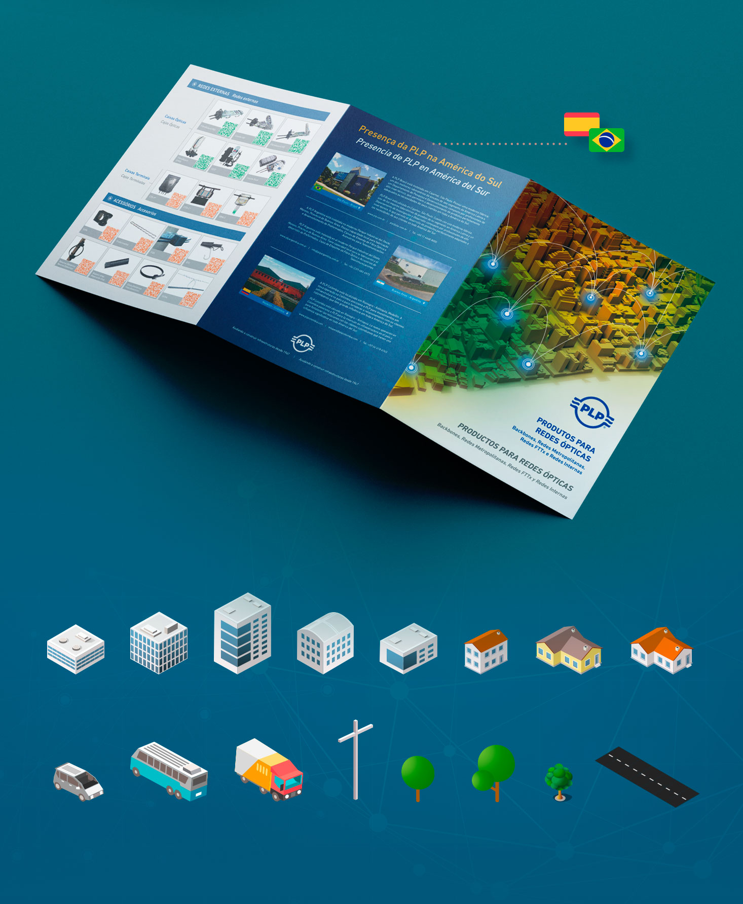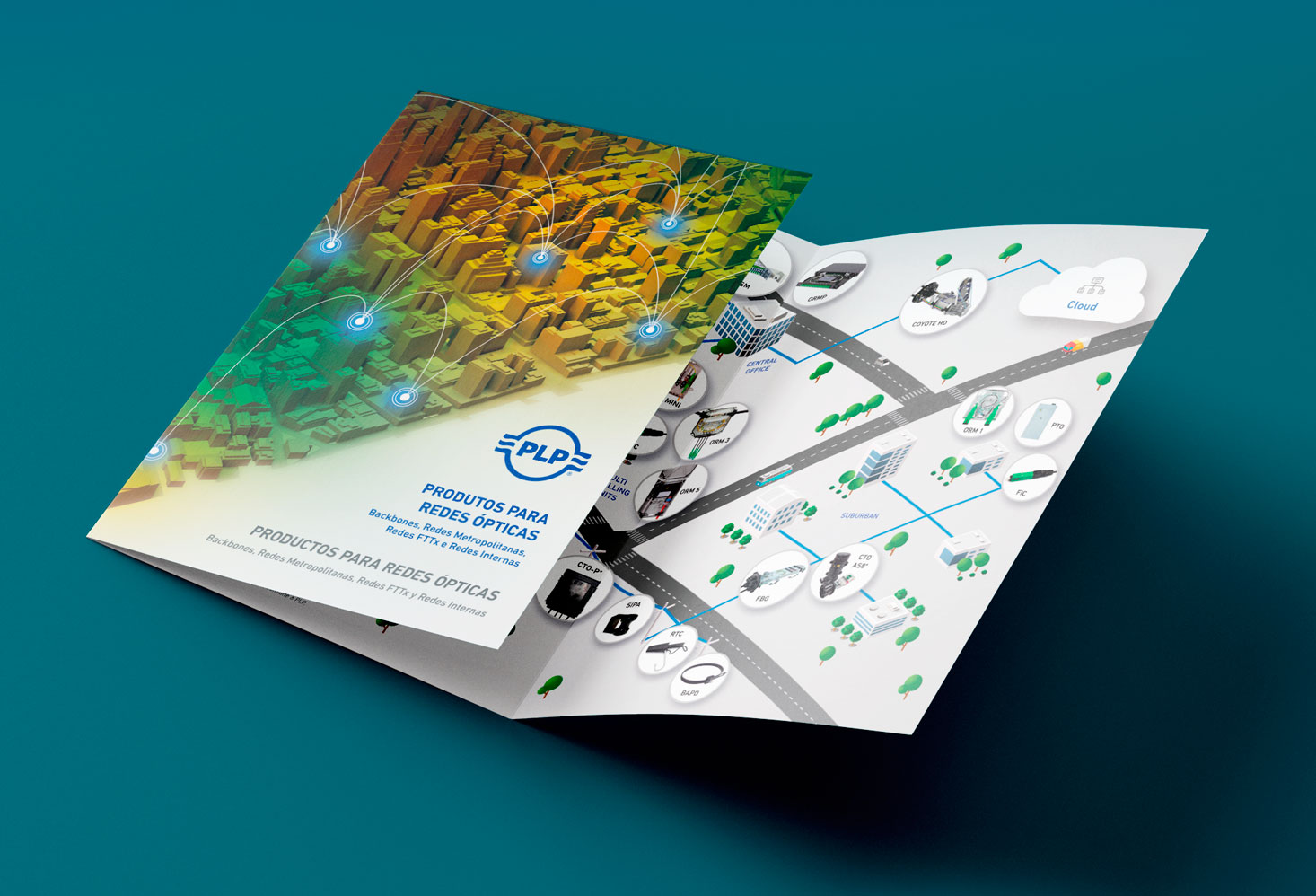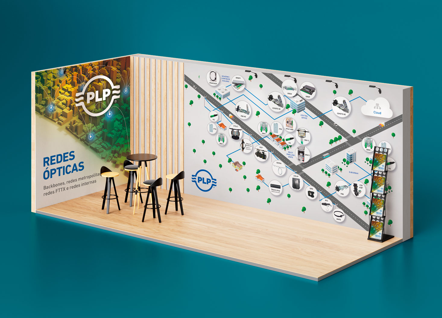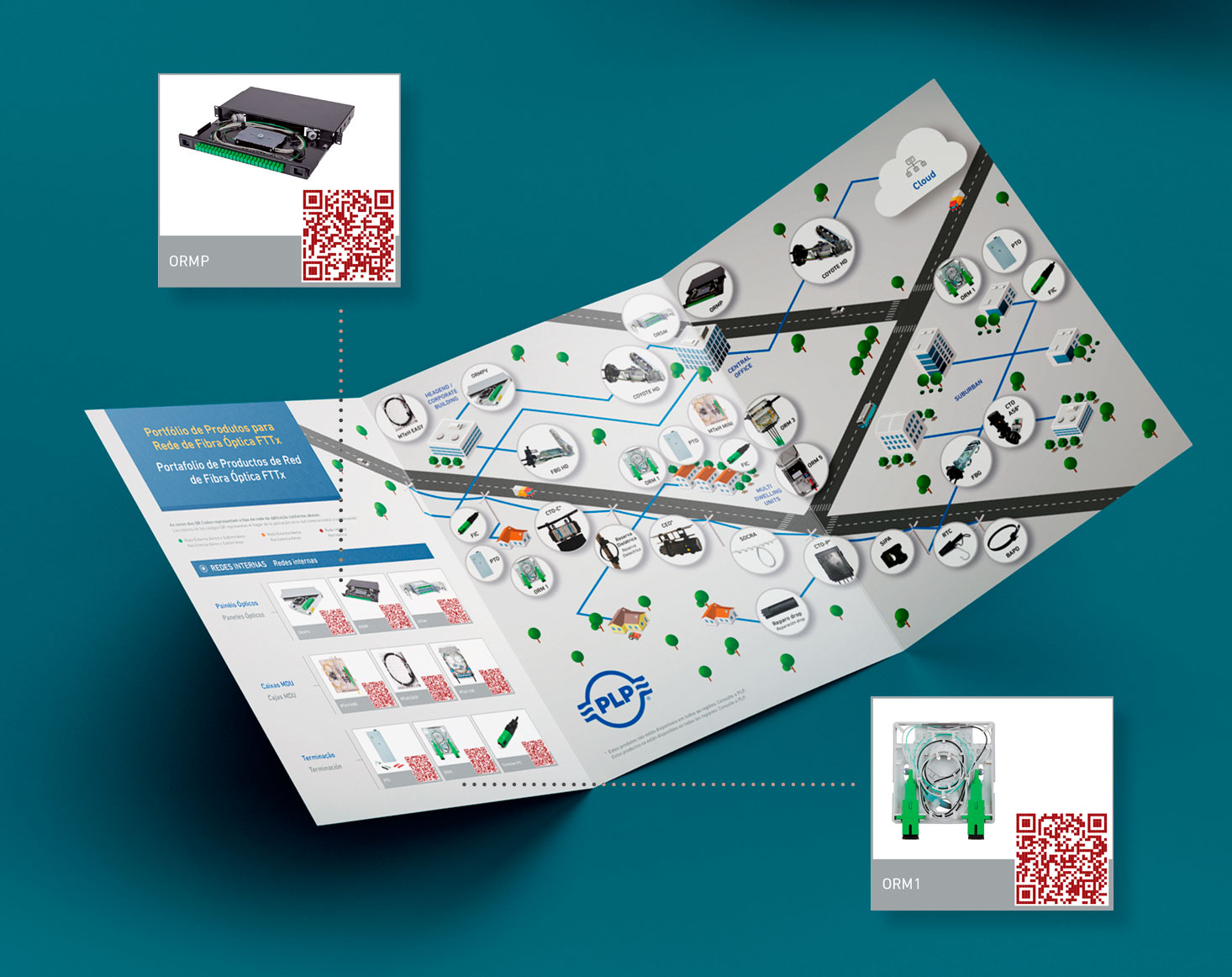 A ideia foi criar um mapa apresentando a simulação de uma rede óptica no stand com os respectivos produtos nos locais, onde são usados na vida real. Esse mesmo mapa foi aplicado no folder com os principais produtos da linha. Ao lado de cada produto, aplicamos um QR Code personalizado que levava a pessoa para a sua respectiva página no site da empresa.