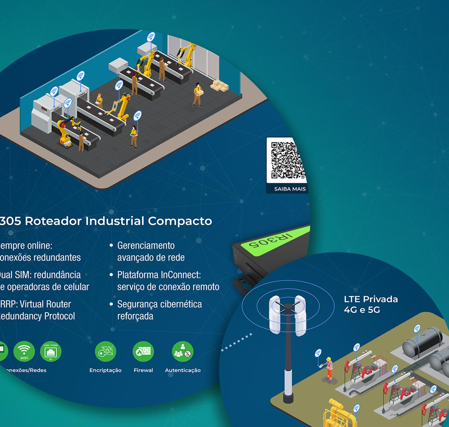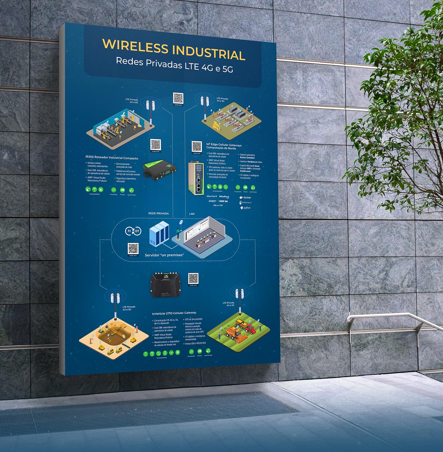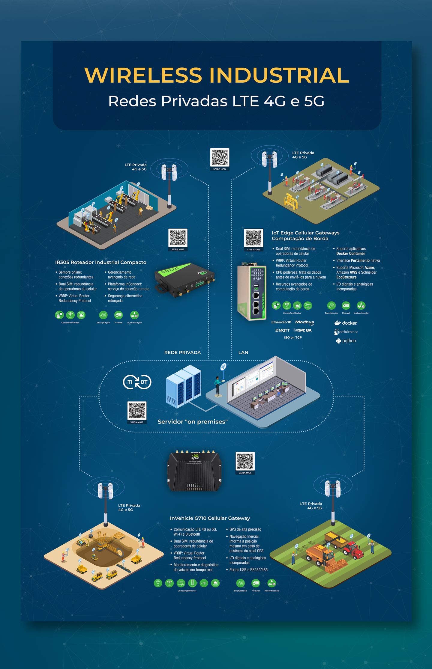O infográfico apresentou a rede de comunicação entre campo e servidores centrais com detalhes técnicos de cada produto, as tecnologias utilizadas e QR codes com acesso às landing pages dos produtos.