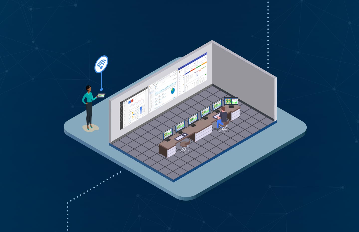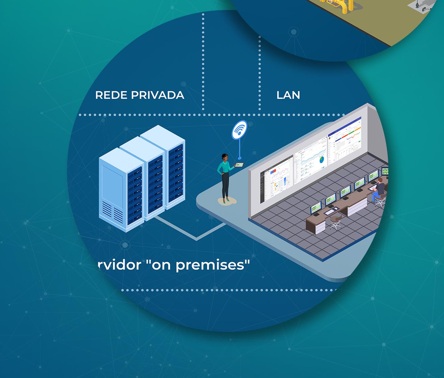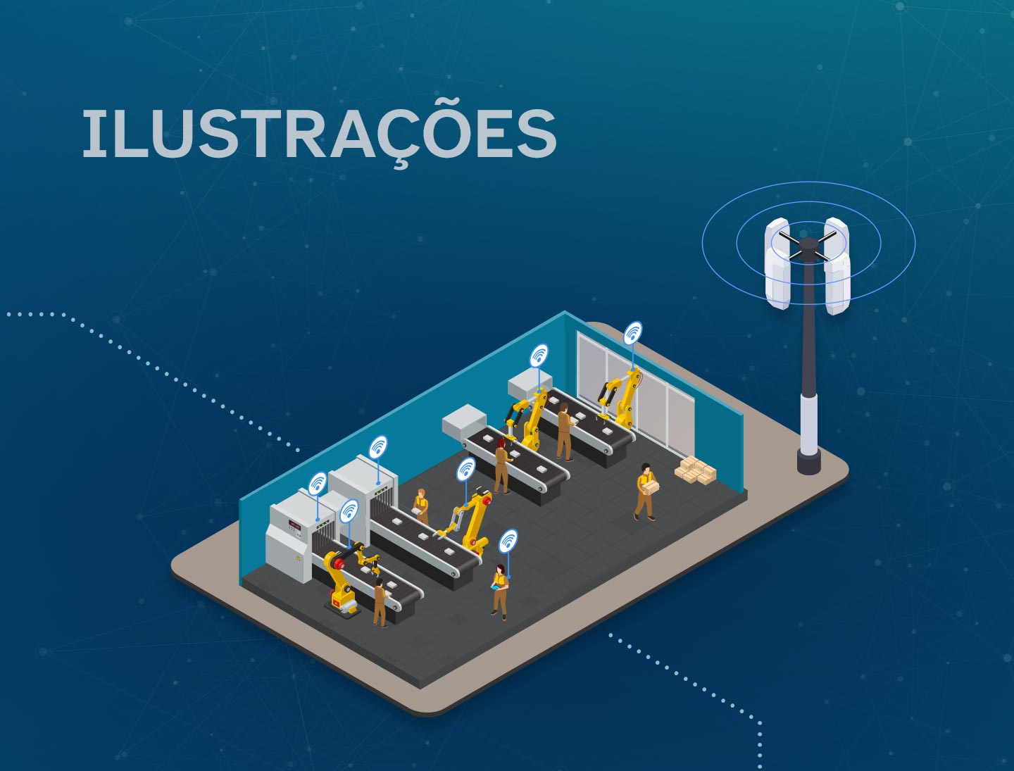 Optei por ilustrações isométricas para a composição do mapa para facilitar a compreensão do fluxo de transmissão de dados que a tecnologia wireless permite.