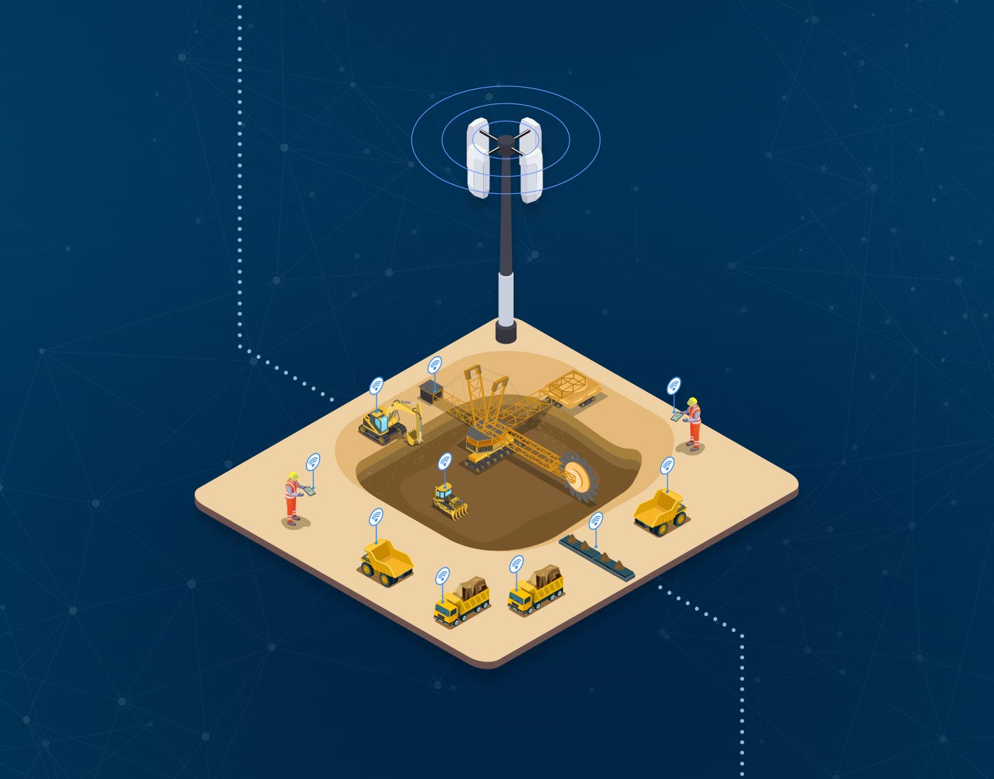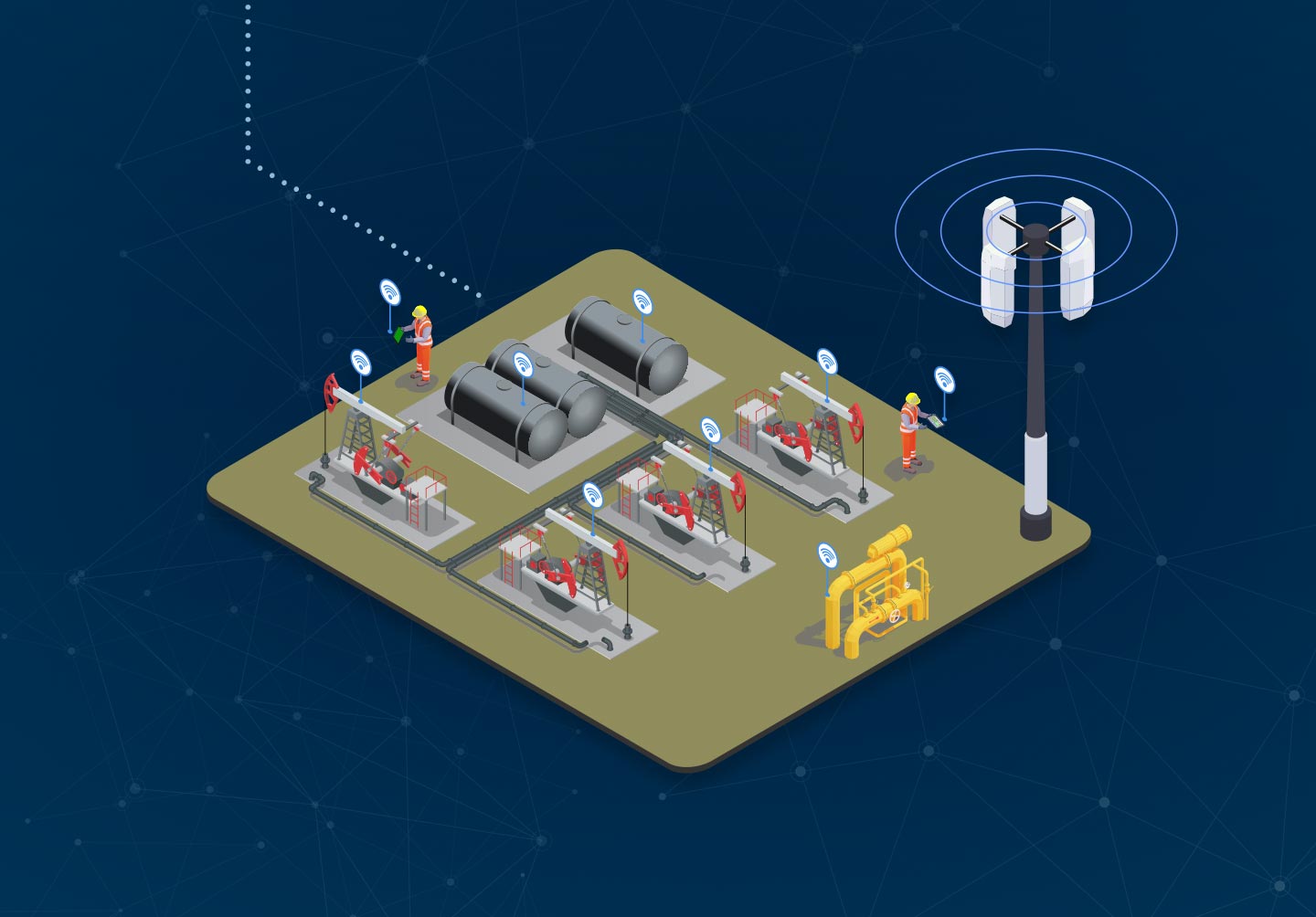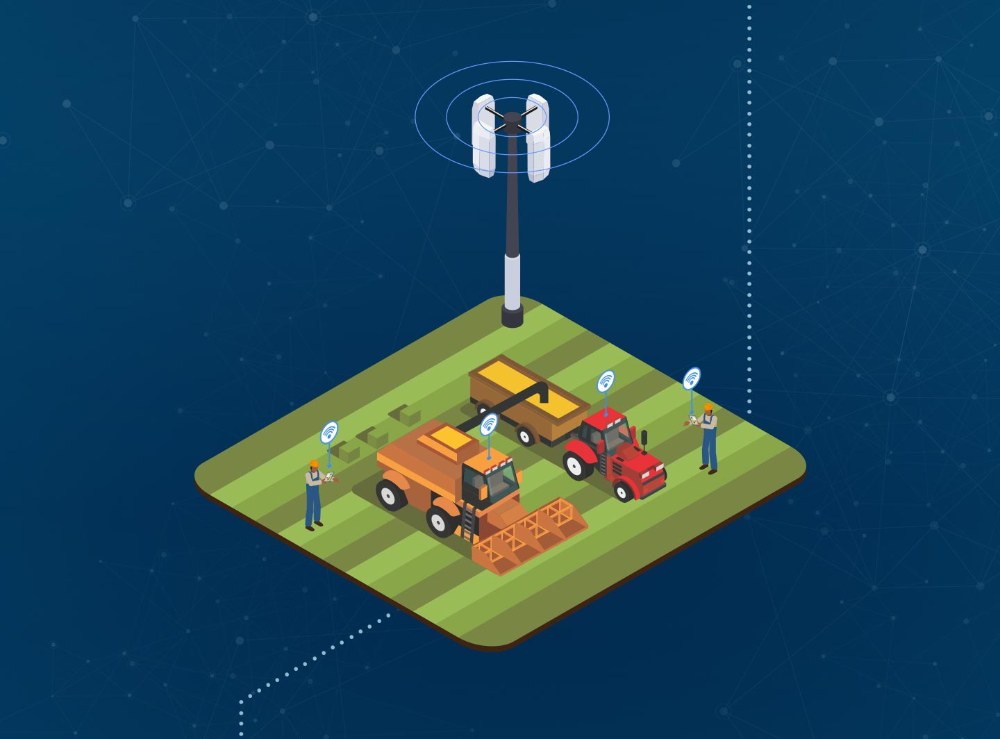 Optei por ilustrações isométricas para a composição do mapa para facilitar a compreensão do fluxo de transmissão de dados que a tecnologia wireless permite.
